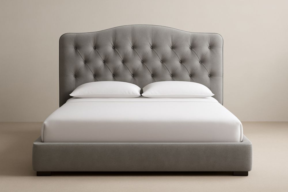 Letto matrimoniale in legno con rivestimento in tessuto grigio
