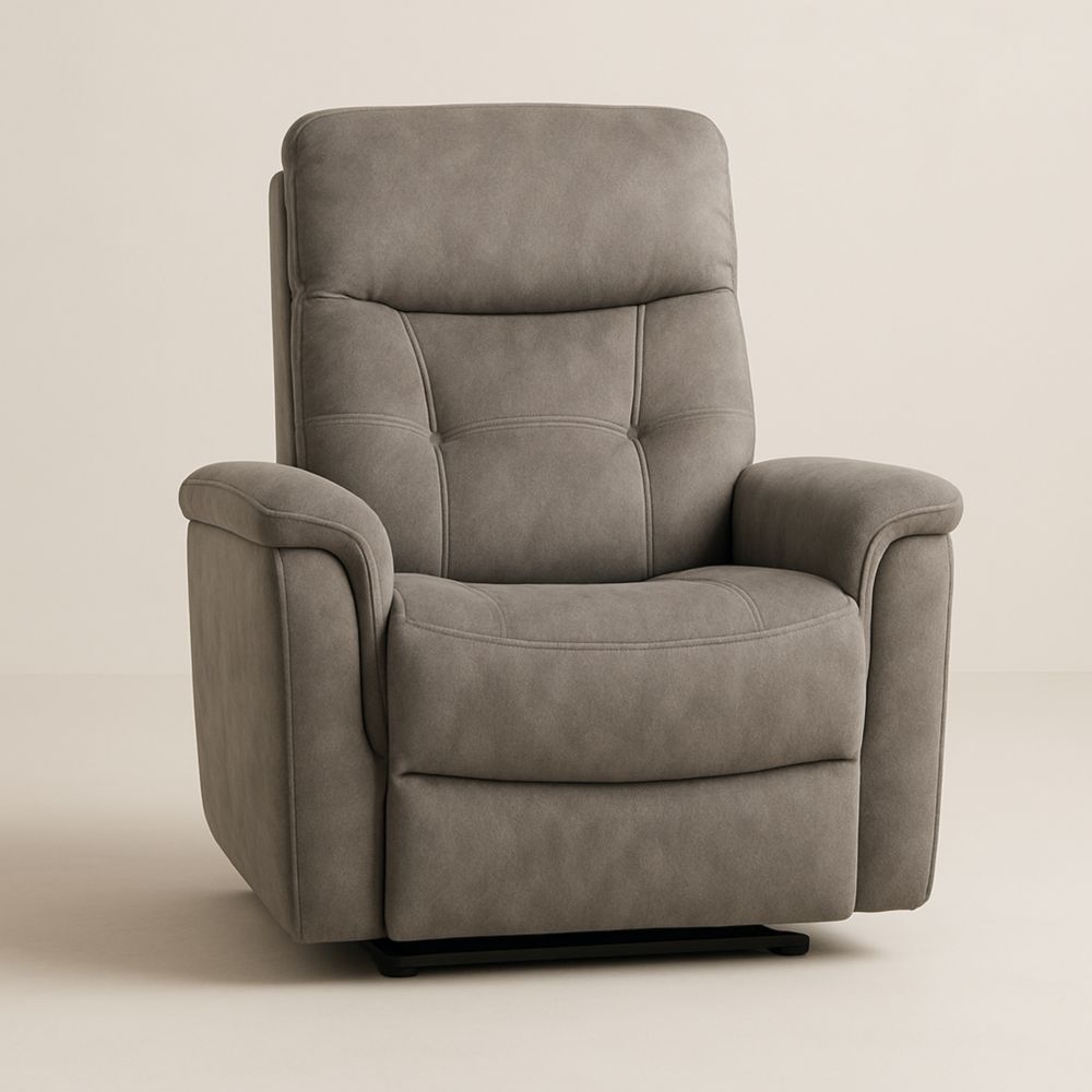 Poltrona con braccioli in tessuto microfibra grigio, struttura in legno e acciaio